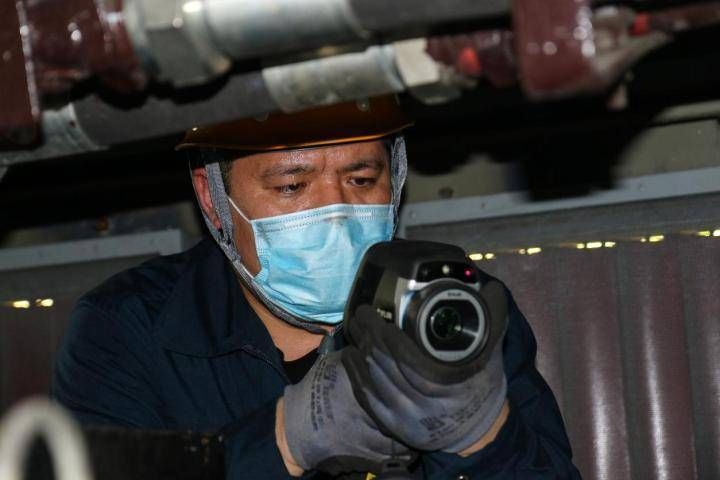 在机车柴油机的作用下,这里的温度达到60℃高温,尽管热得几乎窒息,为了防止烫伤,王大辉依然要穿着厚实的作业服、安全帽。拿着红外线热成像检测仪,盯着显示屏上的红外线成像,检测仪射出的红光在各个部件间游动,他不时地扣动扳机,记录图像。