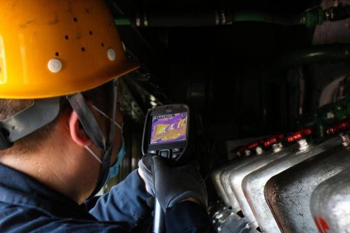 在高温和巨大噪音的“包围”中,王大辉用手中的红外热成像仪精准地扫描在各个部件的测温点上,电器元件、接触器、接线端子、水泵、轴承、散热单节……完成一台机车的监测作业至少需要半个多小时的时间。起初汗如雨下的他,满满地就感觉不到自己在出汗了,因为汗水还没有往下淌就已经被烘干了。